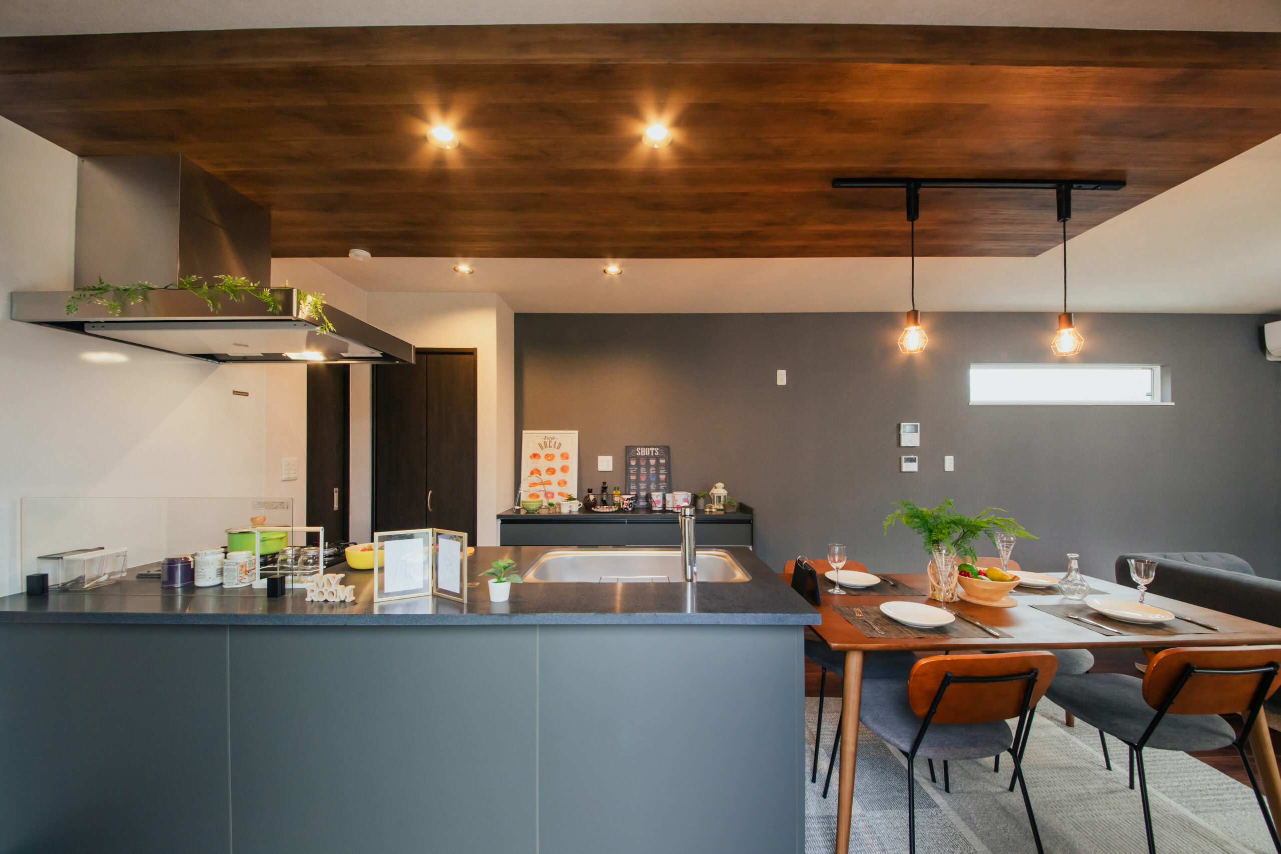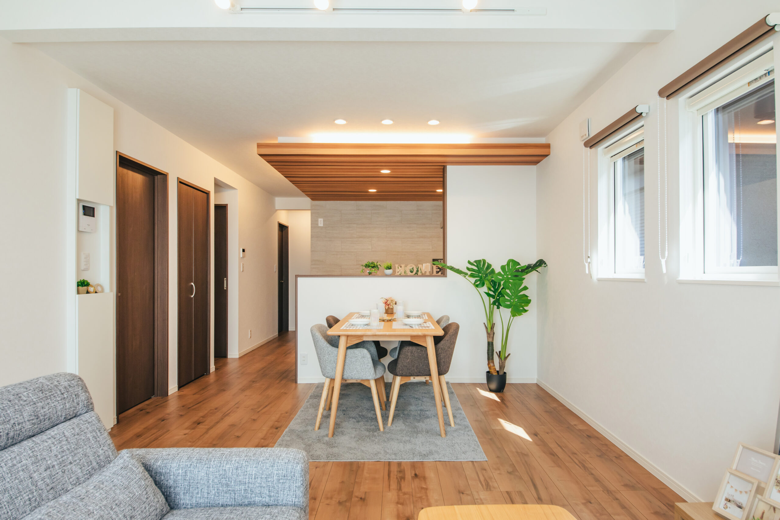 木目調の下がり天井は、空間に温かみをプラスしつつ、